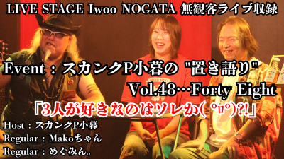 | EVENT | 無観客ライブ収録プレミア公開【スカンクP小暮の"置き語り"Vol.48…Forty Eight「3人が好きなのはソレか( ºロº)?!」】 |